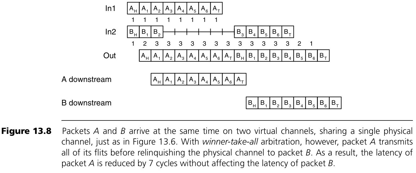 예를 들어, 하나는 2/3 packet/cycle의 비율로 꾸준히 전송하고, 다른 하나는 1/3 packet/cycle 비율이지만 한꺼번에 몰아보낸다. 이 두 flow가 1 packet/cycle의 channel을 공유하면, non-bursty flow의 jitter는 1에서 2 cycle로 증가하고, bursty flow는 최대 4 cycle의 delay를 겪는다. 이는 bursty한 flow가 다른 flow의 delay나 jitter에 큰 영향을 미칠 수 있음을 보여준다.