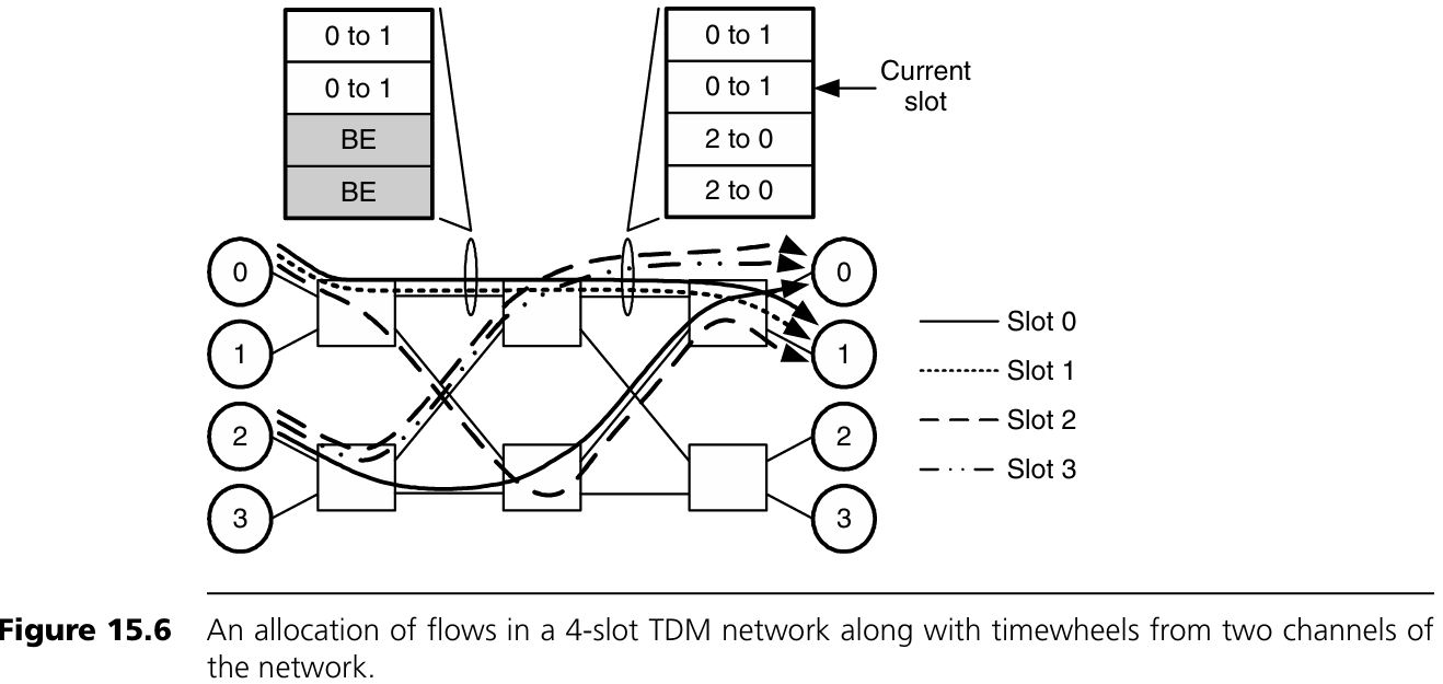 TDM 방식에서는 시간을 일정한 크기의 slot으로 나누고, 각 slot은 flit 하나를 전송할 수 있는 시간에 대응한다. 예를 들어 시간 단위를 32개의 slot으로 나누고, 각 slot이 1 flit 전송 시간이라면, bandwidth가 1 GByte/s인 채널에서 최소 32 MByte/s 단위로 bandwidth를 할당할 수 있다. 어떤 flow가 256 MByte/s를 요구한다면, 필요한 자원마다 8개의 slot을 요청하면 된다.