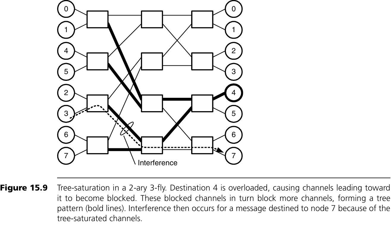 그림 15.9는 이 개념을 보여준다. 예를 들어 destination 4가 과부하되어 해당 방향 채널들이 막히면, 그 채널로 이어지는 다른 채널들도 전파적으로 막히게 된다. 이때 어떤 packet이 destination 7로 가고자 하더라도, 해당 경로가 saturation tree에 포함되어 있다면 직접적으로 연관되지 않은 hot-spot 때문에 간접적 정체가 발생할 수 있다. 이 문제는 단지 목적지 노드에 국한되지 않고, 네트워크 채널 자체의 과부하로도 발생할 수 있다.