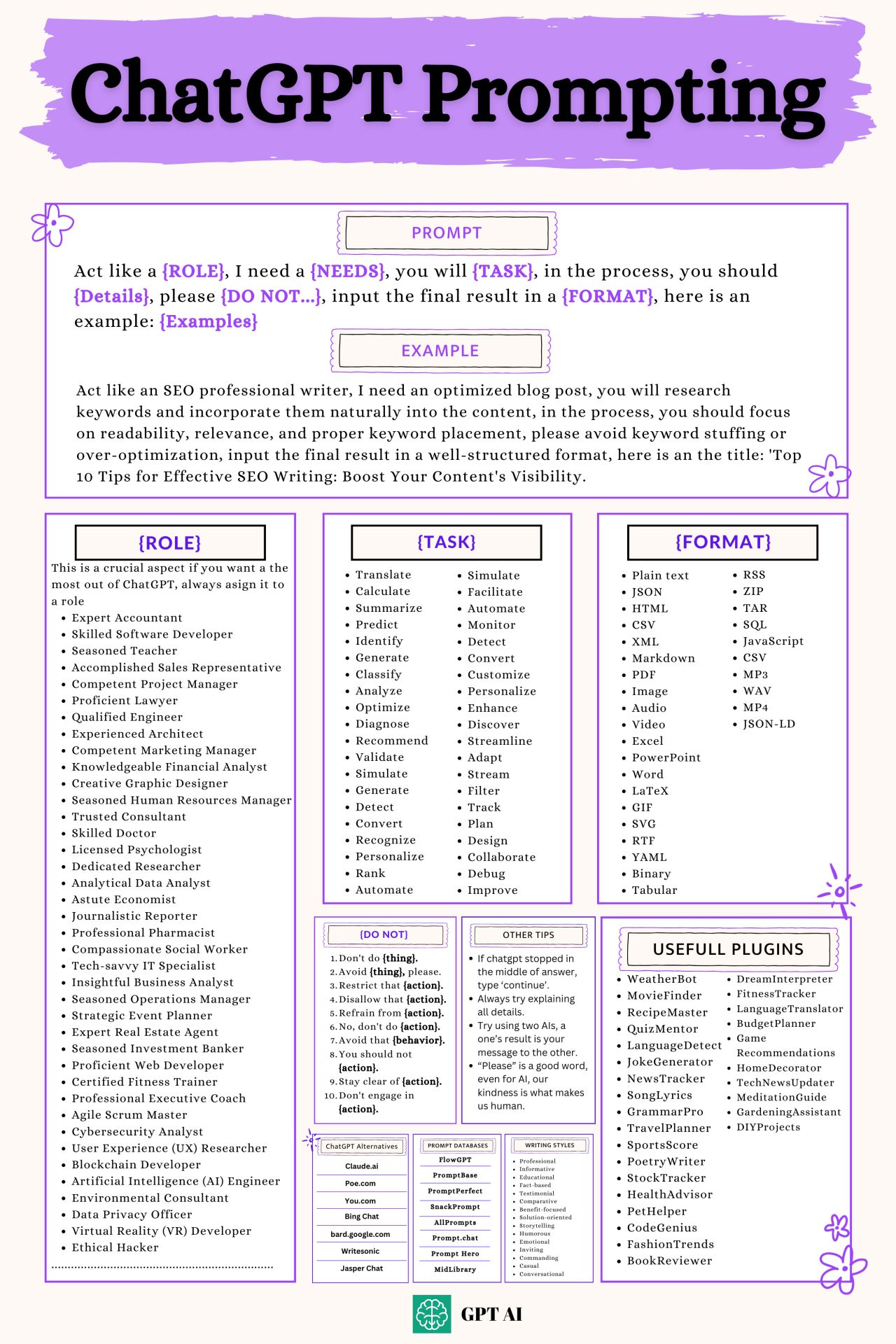 ChatGPT와의 대화를 한 단계 업그레이드하고 싶으신가요? 여기 제가 발견한 멋진 안내서가 있어요! 이것은 프롬프트를 효과적으로 구성하여 ChatGPT와의 상호작용을 최적화하는 방법을 알려줍니다. '역할', '필요', '작업', 그리고 '결과 형식'에 대한 명확한 지침을 제공하여, 원하는 결과를 얻기 위한 명확한 지침을 제공합니다. 플러그인 추천부터 채팅봇 대안에 이르기까지, 이 안내서는 ChatGPT를 사용하는 데 있어 필수적인 자원이 될 것입니다.