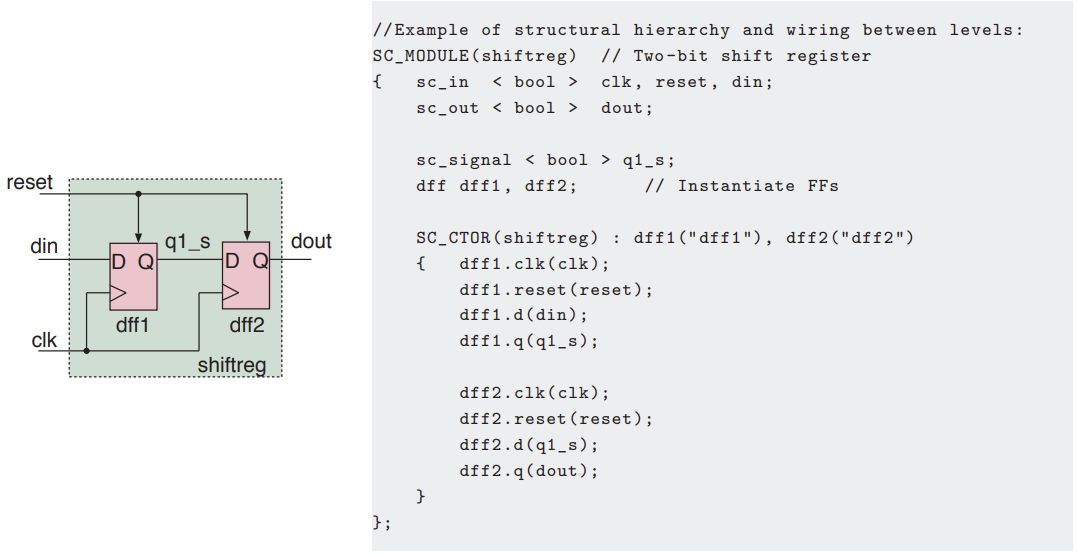 Schematic (left) and SystemC structural netlist (right) for a 2-bit shift registe