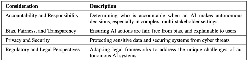 표 11은 Agentic AI에 대한 주요 윤리적 및 거버넌스 고려 사항을 요약하며, 이러한 시스템이 점점 더 자율적으로 발전함에 따라 발생하는 복잡성을 강조한다.
