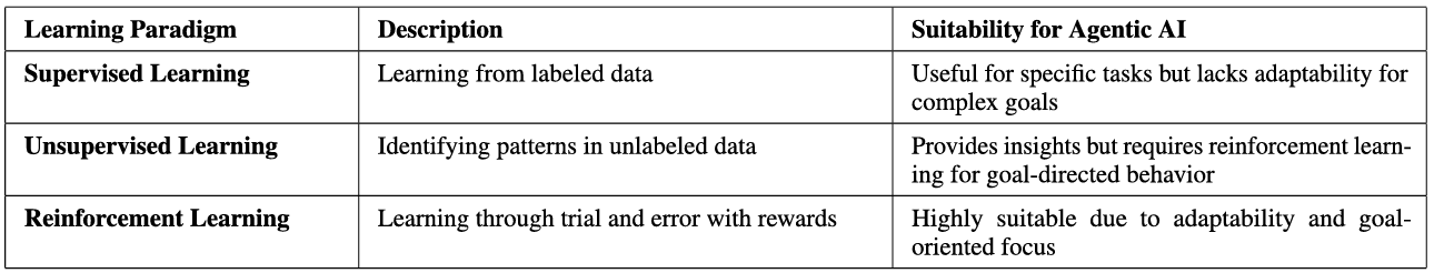 Agentic AI는 다양한 유형의 작업과 목표에 적합한 여러 학습 패러다임에 의존한다. 에이전트 시스템에서 사용되는 주요 패러다임은 지도 학습, 비지도 학습, 강화 학습이다. 표 4는 비교를 제공한다.
