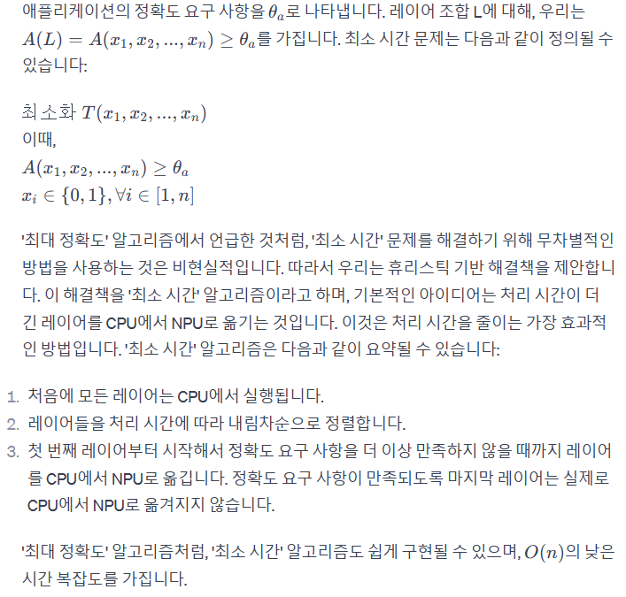 다양한 DNN 모델 레이어는 서로 다른 부동 소수점 연산을 수행하므로, NPU나 CPU에서 실행될 때 처리 시간과 정확도 측면에서 다른 특성을 가집니다. 일부 레이어는 NPU에서의 낮은 정밀도 부동 소수점 연산에 민감하며, NPU에서 실행될 경우 정확도가 떨어집니다. 다른 일부 레이어는 계산 집약적이며, CPU에서 실행될 경우 처리 시간이 길어집니다. 이 논문에서는 모바일 장치에서 NPU를 사용하여 DNN 모델을 실행할 때 이러한 특별한 특성을 식별합니다. 우리는 '최대 정확도' 문제와 '최소 시간' 문제를 정식화하고, 식별된 특별한 특성에 기반하여 해결하기 위한 휴리스틱 기반 솔루션을 제안합니다. 더 구체적으로, 우리는 모델 분할 기술을 제안하여 지연 및 정확도 요구 사항을 충족하기 위해 어떤 레이어를 CPU에서 실행하고 어떤 레이어를 NPU에서 실행할지 결정합니다.