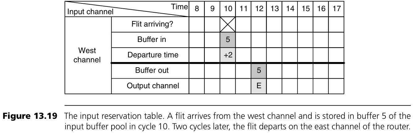 control flit이 도착하면, 해당 data offset 정보를 통해 routing logic이 data flit의 도착 시간과 목적지 포트를 input reservation table에 기록한다(Figure 13.19 참조).