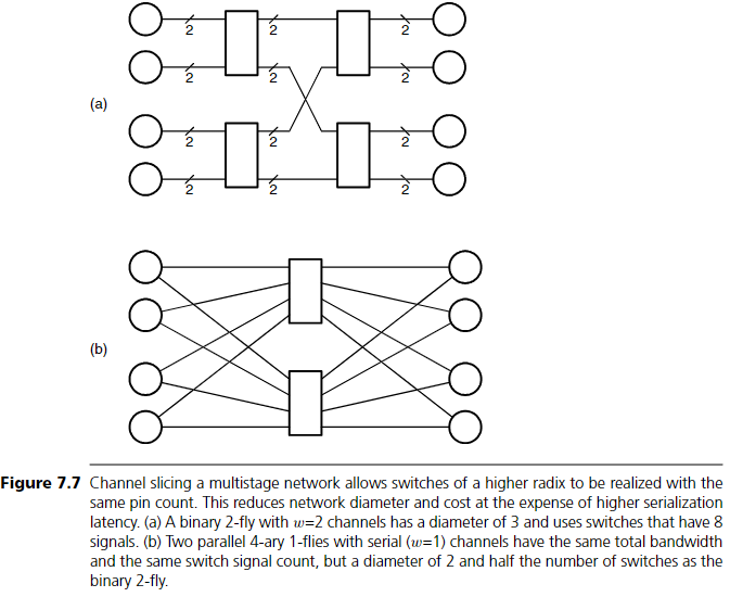 Figure 7.7에서는 2비트 channel을 갖는 binary 2-fly network를, 직렬 전송(1비트 channel)의 4-ary 1-fly 두 개로 대체하여 비용과 diameter를 줄이는 예시를 보여준다. 두 방식 모두 같은 bandwidth를 제공하며, switch당 동일한 pin 수(8개 signal)를 사용한다. 그러나 channel-sliced 구조는 diameter가 작고 필요한 switch 수도 절반이다.