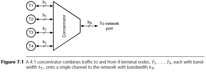 Concentrator는 특히 bursty한 트래픽 특성을 가진 terminal들을 묶을 때 자주 사용된다. network 측 channel의 bandwidth를 공유함으로써 bursty source들의 부하를 완화하고 channel bandwidth를 효율적으로 사용할 수 있다.