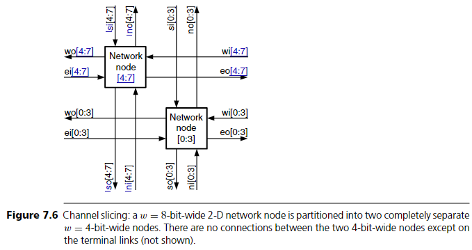 Figure 7.6은 channel slicing을 보여준다. w=8bit의 2D network node는 w=4bit의 두 개의 node로 완전히 분리된다. 두 network 간에는 어떠한 연결도 없으며, terminal 링크 (그림에는 표시되지 않음)만 연결된다.