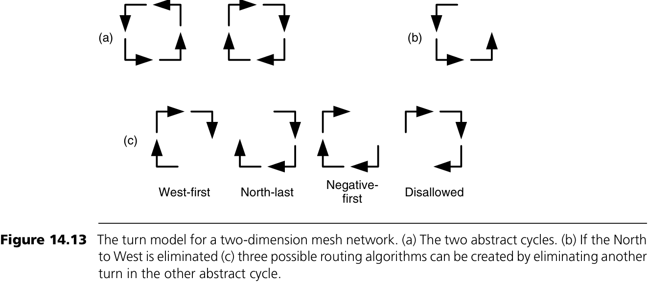 - 14.3: Figure 14.13(c)의 네 번째 turn 제거 방식이 왜 deadlock-free가 아닌지 설명.