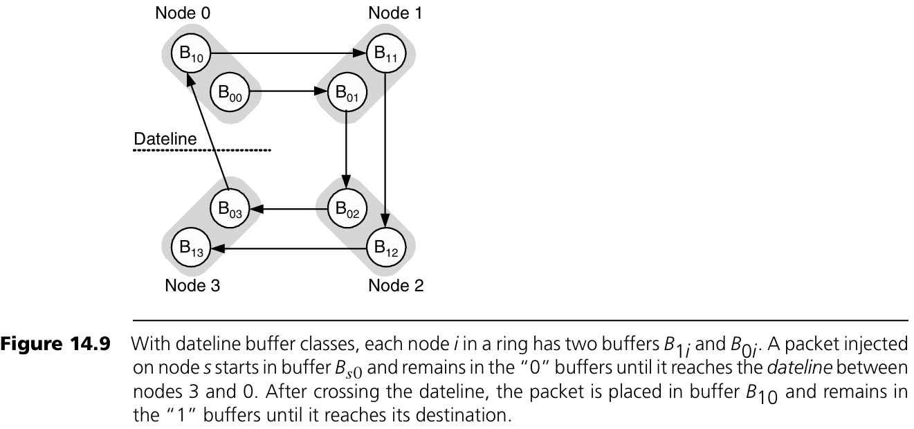 Dateline buffer class를 ring에 적용한 예이다. 각 노드 i는 “0” buffer B0i와 “1” buffer B1i를 가진다. source 노드 s에서 주입된 packet은 B0s에 저장되고, dateline(노드 3과 0 사이)을 지날 때까지는 “0” buffer를 계속 사용한다. dateline을 지나면 “1” buffer(B10)를 사용하고 목적지까지 “1” buffer만 이용한다. 이 방식은 원형 의존 구조를 나선형 비순환 구조로 바꾸므로 deadlock을 방지할 수 있다.
