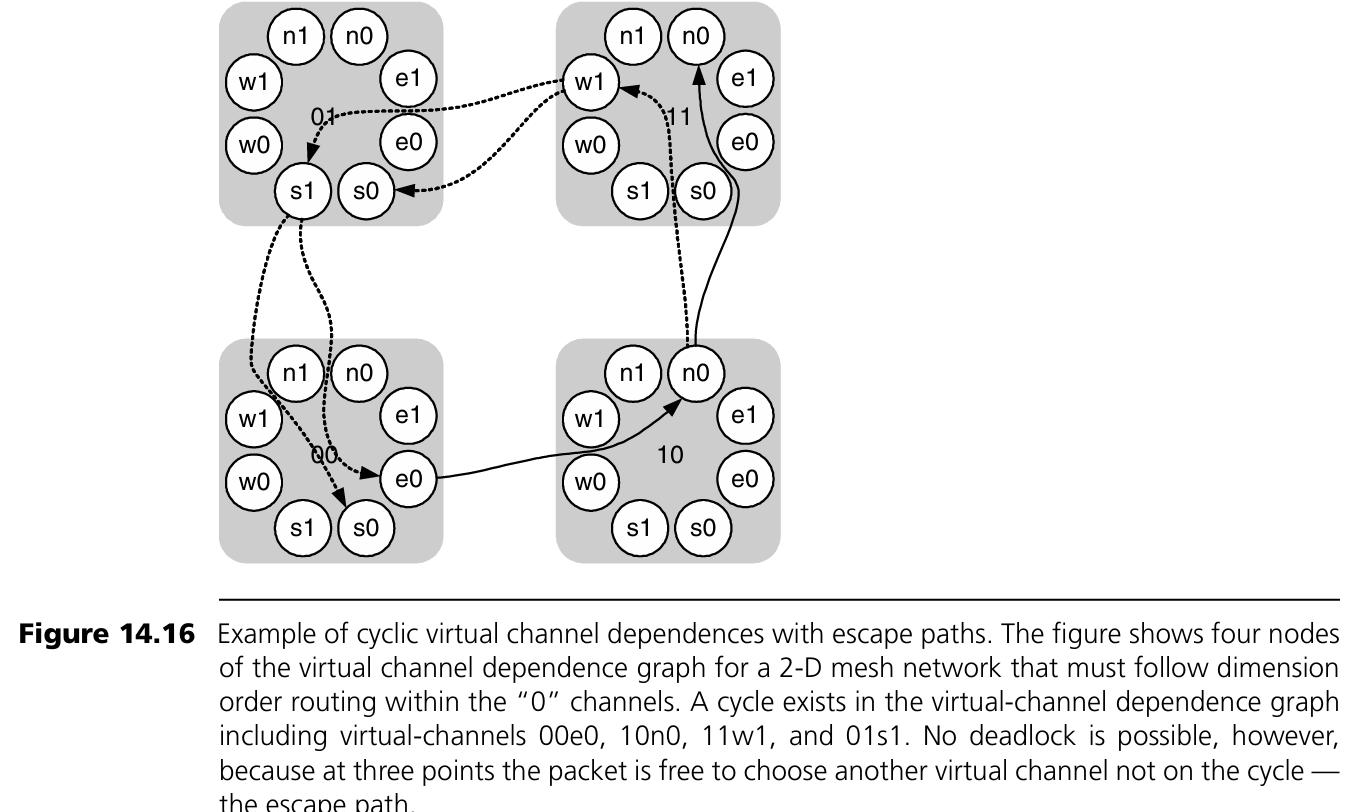 이렇게 하면 Figure 14.5의 cyclic한 virtual channel dependence graph에서 일부 edge를 제거하여 acyclic하게 만들 수 있다.
