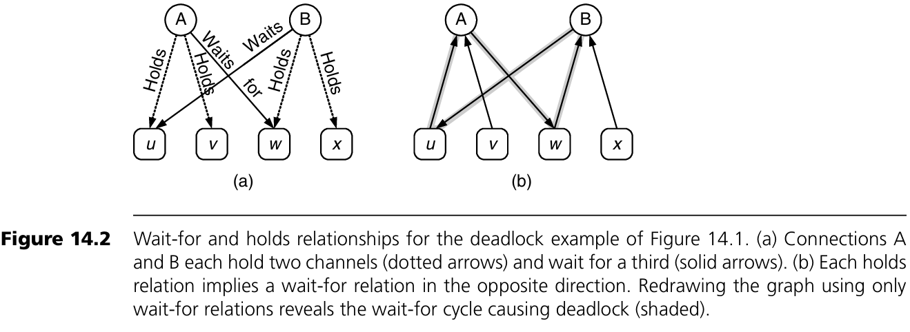 (b)는 deadlocked 상태를 나타낸 wait-for graph이다. P0은 u0와 v0를 점유하고 w0를 기다리며, P1은 w0와 x0를 점유하고 v0를 기다린다. "1"로 끝나는 virtual channel은 사용되지 않는다. 만약 P0이 w0 또는 w1 중 사용 가능한 것을 선택할 수 있다면, 이 구성은 deadlock이 아니다. 모든 virtual channel 중 아무거나 사용할 수 있는 경우, deadlock 구성을 위해선 4개의 packet이 필요하며, 이는 연습문제로 제시된다.