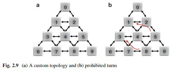 Table 2.6은 Fig. 2.9a에 나타난 topology의 node 0에 대한 routing table을 보여준다. 각 경로는 node 0에서 특정 목적지로 가는 경로채널 이름을 사용하여 지정한다.
