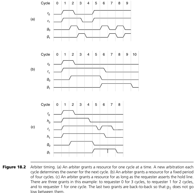 그림 18.6은 4비트 round-robin arbiter를 도식화한 것이다. 현재 cycle에 grant가 발생하면, 해당 gi 라인 하나가 high가 되고, 다음 cycle에는 pi+1이 high가 되어 그 다음 요청이 가장 높은 우선순위를 갖게 된다. 이전에 grant를 받았던 요청은 다음 arbitration에서 가장 낮은 우선순위를 갖는다. 만약 현재 cycle에 어떤 grant도 발생하지 않으면, anyg가 low가 되어 우선순위 상태는 유지된다.