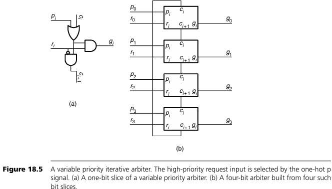 그림 18.4(a)와 같이 반복형 arbiter의 비트 셀을 구성할 수 있다. 이 비트 셀은 요청 입력 ri와 carry 입력 ci를 받아 grant 출력 gi와 carry 출력 ci+1을 생성한다. 이 논리를 식으로 표현하면 다음과 같다: