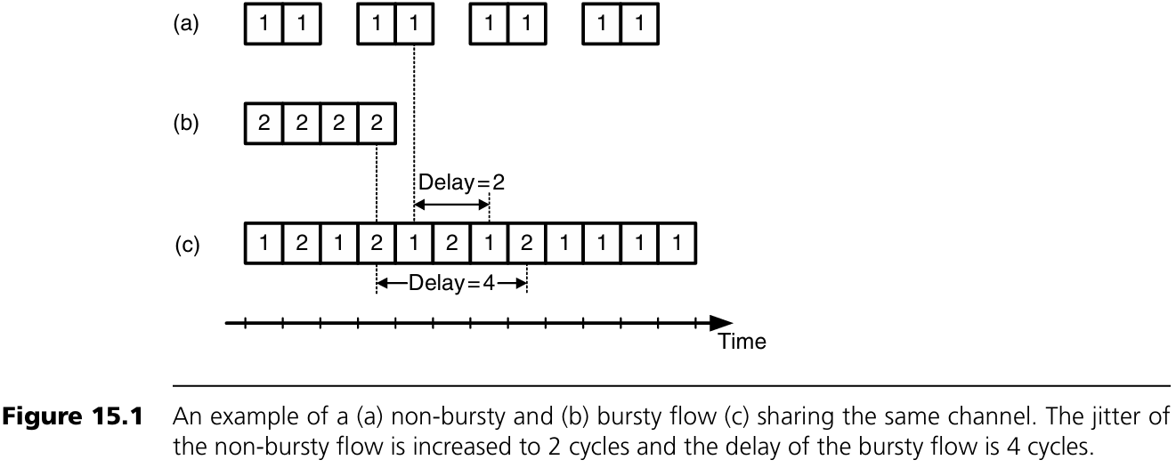 예를 들어, 하나는 2/3 packet/cycle의 비율로 꾸준히 전송하고, 다른 하나는 1/3 packet/cycle 비율이지만 한꺼번에 몰아보낸다. 이 두 flow가 1 packet/cycle의 channel을 공유하면, non-bursty flow의 jitter는 1에서 2 cycle로 증가하고, bursty flow는 최대 4 cycle의 delay를 겪는다. 이는 bursty한 flow가 다른 flow의 delay나 jitter에 큰 영향을 미칠 수 있음을 보여준다.