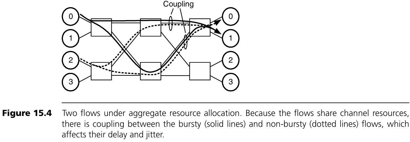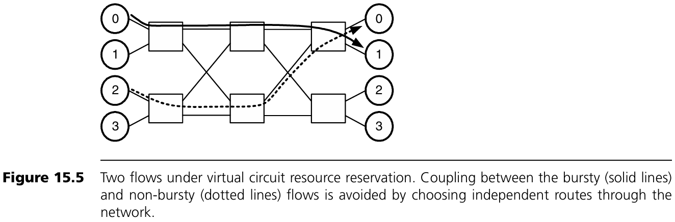 그림 15.4의 예를 보자. 2-ary 2-fly 네트워크에 stage를 하나 더 추가하고, 트래픽을 중간 단계에서 random switch를 통해 목적지로 보낸다. 여기에는 bursty한 flow (노드 0 → 1)와 non-bursty한 flow (노드 2 → 0)가 있다. 자원을 flow별로 고정할 수 없는 aggregate 방식에서는 두 flow 사이에 coupling이 생기며, 이로 인해 non-bursty flow의 jitter가 증가한다. 또한 randomized routing은 시간뿐 아니라 공간에서도 burstiness를 유발한다. 평균적으로는 균형이 맞지만, 순간적으로는 불균형이 생기기 때문이다.