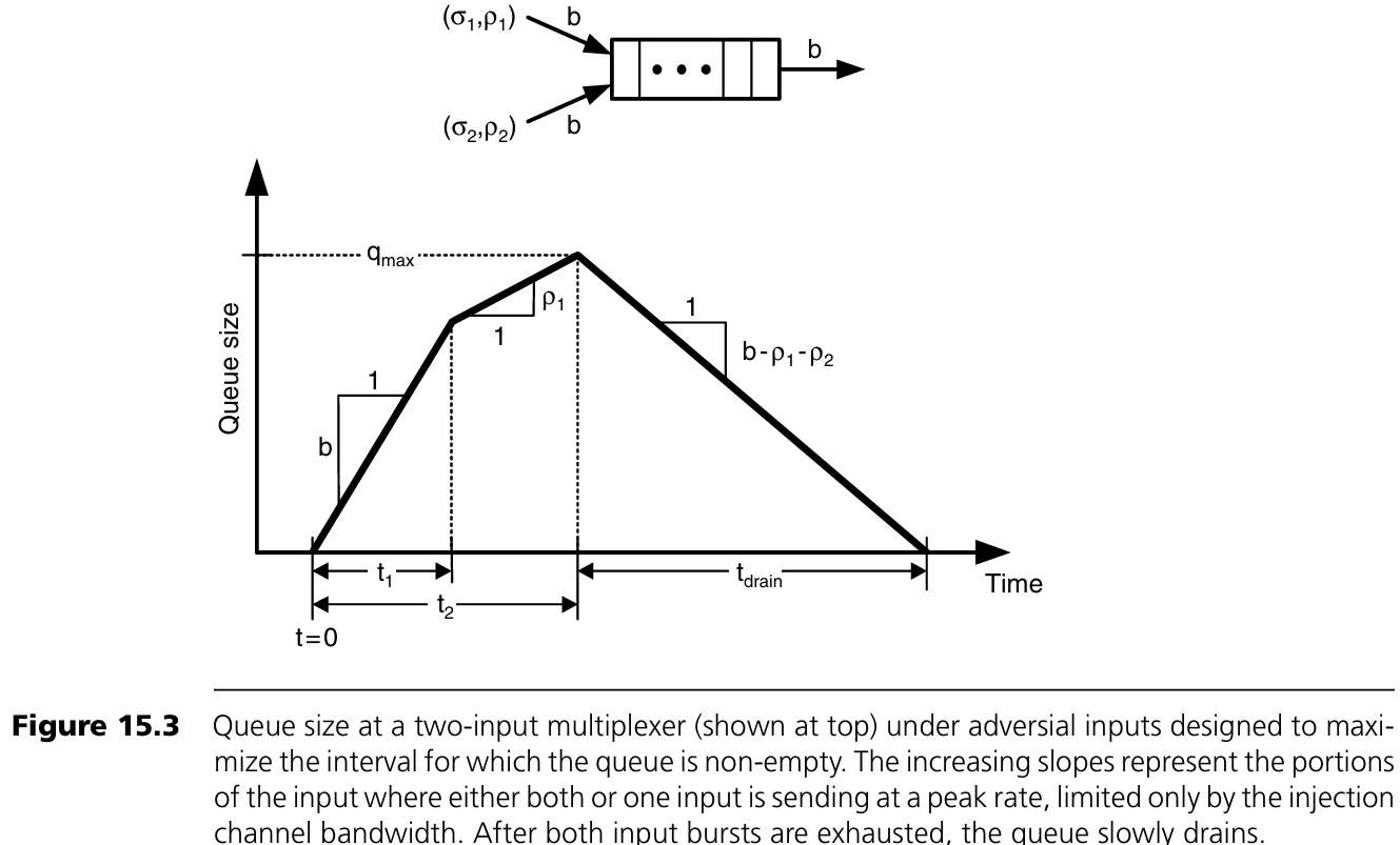그림 15.3은 multiplexer의 queue 크기를 시간에 따라 나타낸 것으로, queue가 비어 있지 않은 최대 구간을 만들기 위한 adversarial input에 대한 전략을 보여준다. 기울기가 증가하는 구간은 한쪽 또는 양쪽 입력이 injection channel bandwidth가 허용하는 최대 속도로 전송하는 구간을 나타낸다. 양쪽의 burst가 끝나면 queue는 서서히 비워진다.