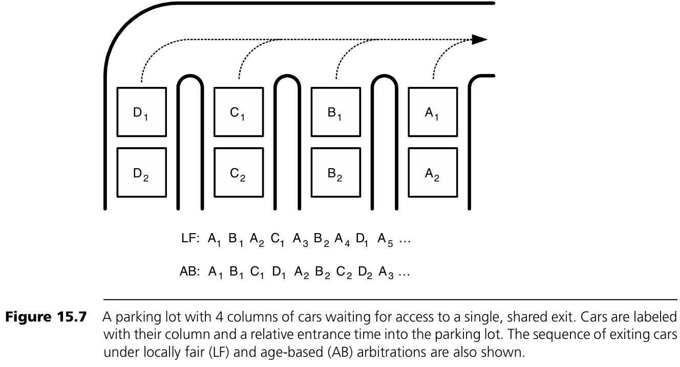 일반적인 운전 예절에서는 병합 지점에서 번갈아 차를 보내는 것이 공정하다. 이를 locally fair arbitration이라 부른다. 이 방식에서는 각 병합 지점에서 차들이 번갈아 나가므로 겉보기에 공정해 보인다. 하지만 D1은 가장 먼저 도착했음에도 불구하고, A열 차들보다 훨씬 늦게 출구에 도달한다. 24열까지 확장하면 마지막 열의 첫 번째 차량은 1년 이상 기다려야 나갈 수 있을 것이다.