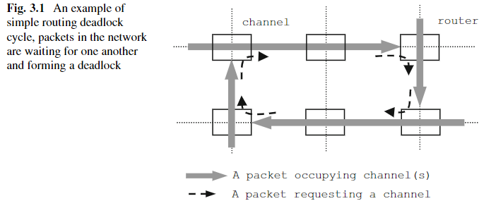 Deadlock은 두 개 이상의 packet(agent)이 서로의 자원(channel)을 기다리며 교착 상태에 빠지는 상황이다. 만약 패킷들 간의 의존성 순환(dependency cycle)이 형성되면 네트워크는 deadlock 상태가 된다. 예를 들어, Fig. 3.1과 같은 네 개의 패킷이 각각 어떤 채널은 점유하고 있으나, 다음 진행을 위해 다른 패킷이 점유한 채널을 요청하고 있는 상황을 생각해 보자. 이러한 경우 어느 누구도 필요한 채널을 얻지 못하고 교착 상태에 빠지게 되며, 이 순환을 외부에서 끊어주기 전까지는 해당 채널 모두 정지 상태로 유지된다.