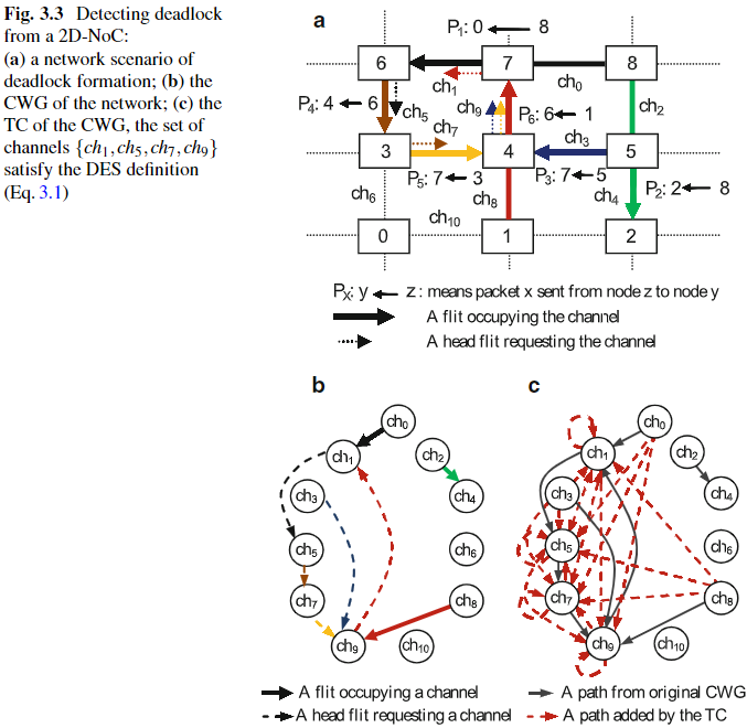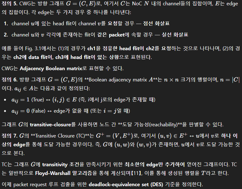 deadlock 검출을 위해서는 채널 간의 의존 관계(CWG: Channel Wait-for Graph)를 기반으로 한 transitive closure (TC) 계산이 필요하다.