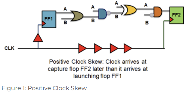 • 양의(Positive) 클럭 스큐: 캡처 플립플롭(FF2)에서 클럭이 늦게 도착 → Setup Timing이 유리하지만 Hold Timing이 어려워짐.