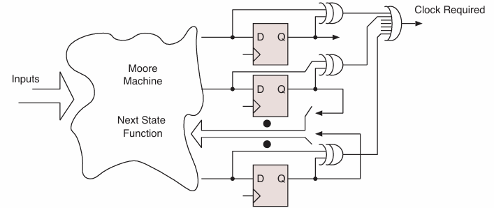 - 플립플롭의 D 입력과 Q 출력의 차이를 비교하여 클럭이 필요한지 판단.
